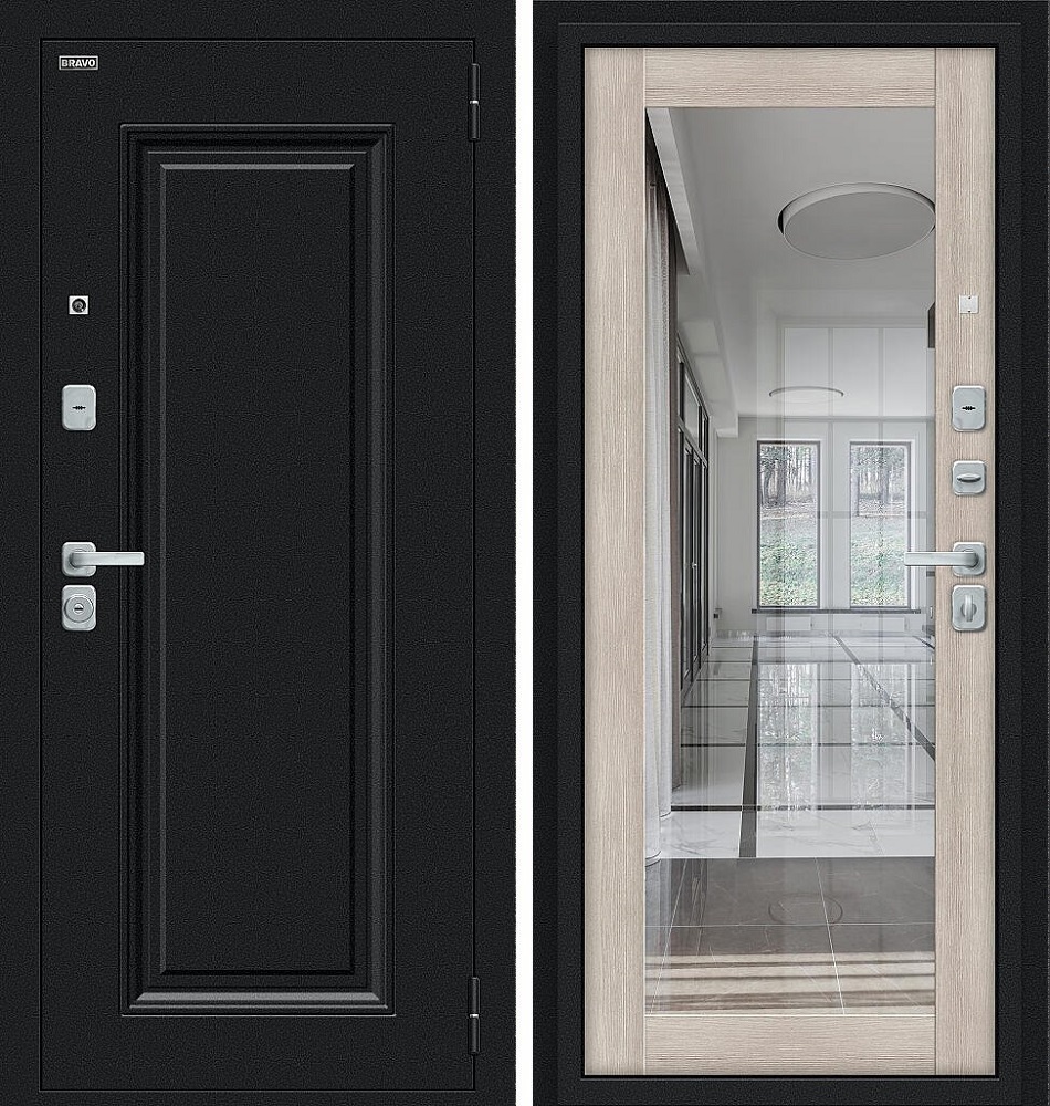 Входная Дверь модель Флэш МФ/BChrome цвет Букле черное/Cappuccino Melinga — современная модель, в которой сочетаются прочность, стильный дизайн и долгий срок службы. Конструкция тщательно продумана, поэтому легко выдерживает высокие механические нагрузки. Дополнительным залогом безопасности является надежная замковая система. Устойчива такая входная дверь и к агрессии среды. Плюс, она обеспечивает комфортный микроклимат в доме за счет отличной тепло- и звукоизоляции. Внутренняя отделка выполнена из износостойких эстетичных материалов, что позволяет полотну гармонировать с интерьером.