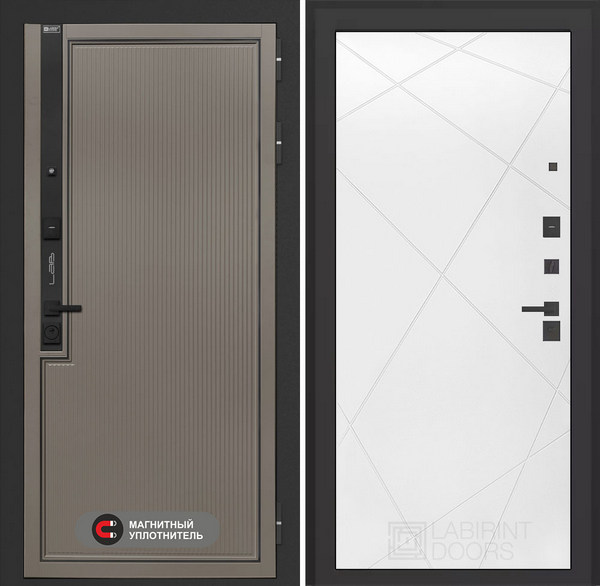 LABIRINT Входная металлическая дверь Лаб-1 Про панель №24 цвет белый софт — надежная модель, которая станет не только защитой от несанкционированного проникновения, но и украшением жилища. Конструкция повышенной прочности хорошо справляется с любыми деформационными нагрузками, а презентабельный вид полотну придают продуманная внутренняя отделка и внешнее покрытие. Все материалы устойчивы к износу и агрессивным воздействиям среды. Также входные двери фабрики LabDoor обладают прекрасной шумо- и теплоизоляцией.