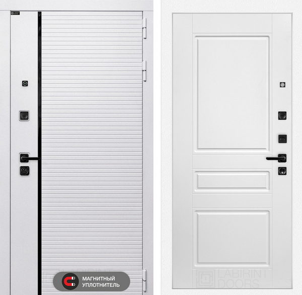 LABIRINT Входная металлическая дверь Роял панель №3 цвет белый софт — надежная модель, которая станет не только защитой от несанкционированного проникновения, но и украшением жилища. Конструкция повышенной прочности хорошо справляется с любыми деформационными нагрузками, а презентабельный вид полотну придают продуманная внутренняя отделка и внешнее покрытие. Все материалы устойчивы к износу и агрессивным воздействиям среды. Также входные двери фабрики LABIRINT обладают прекрасной шумо- и теплоизоляцией.